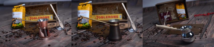 The set consists of copper Turks, wall thickness 1.5mm!!! Gorilla's Coffee 100% Arabica Bourbon from Africa and craft gift box. The set also includes a measuring wooden spoon; an African cork bonfire; signature chocolate